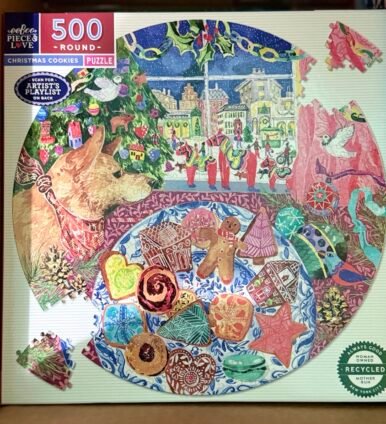 This adorable round puzzle by Hazel Jarvis celebrates the joy of baking and sweet holiday traditions. My daughter and I worked on this one together — and yes, we had to bake cookies while doing it!